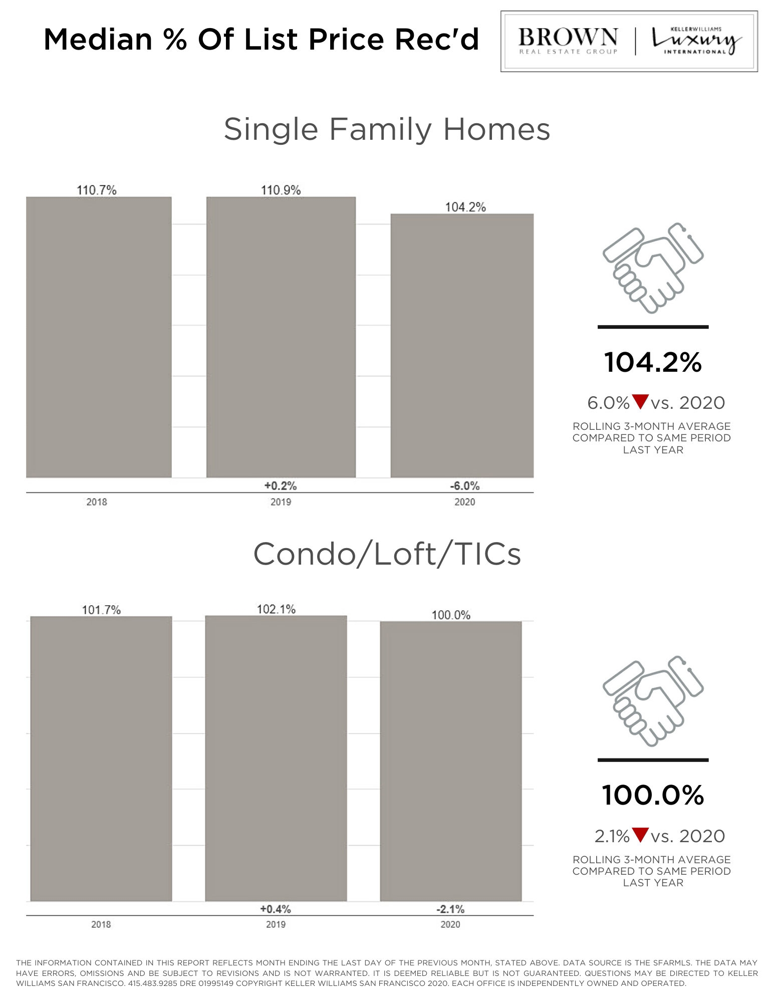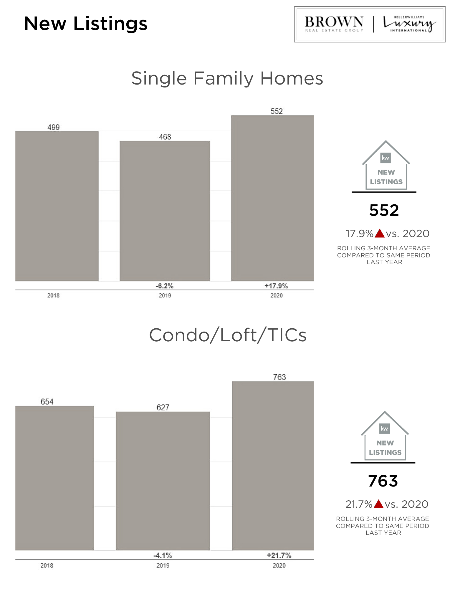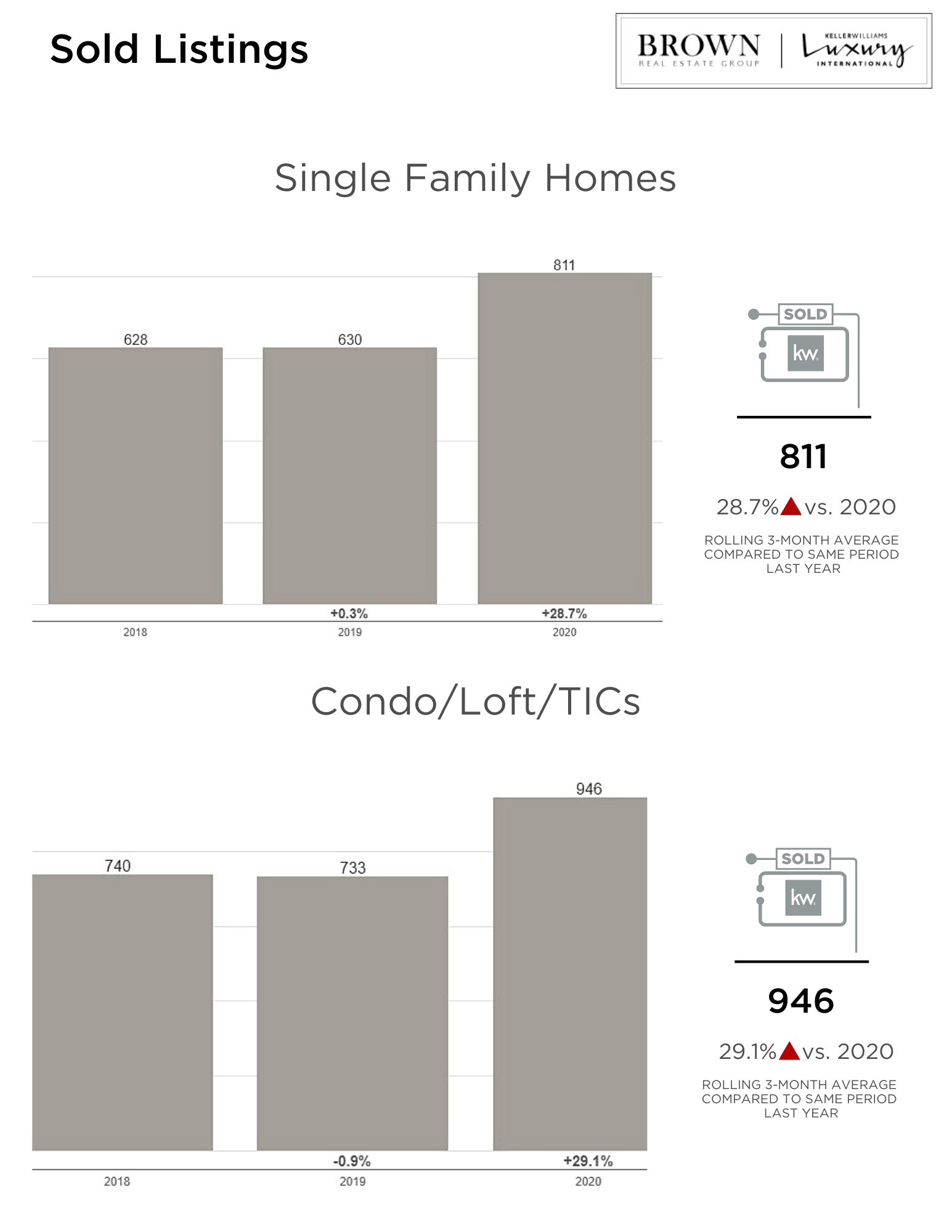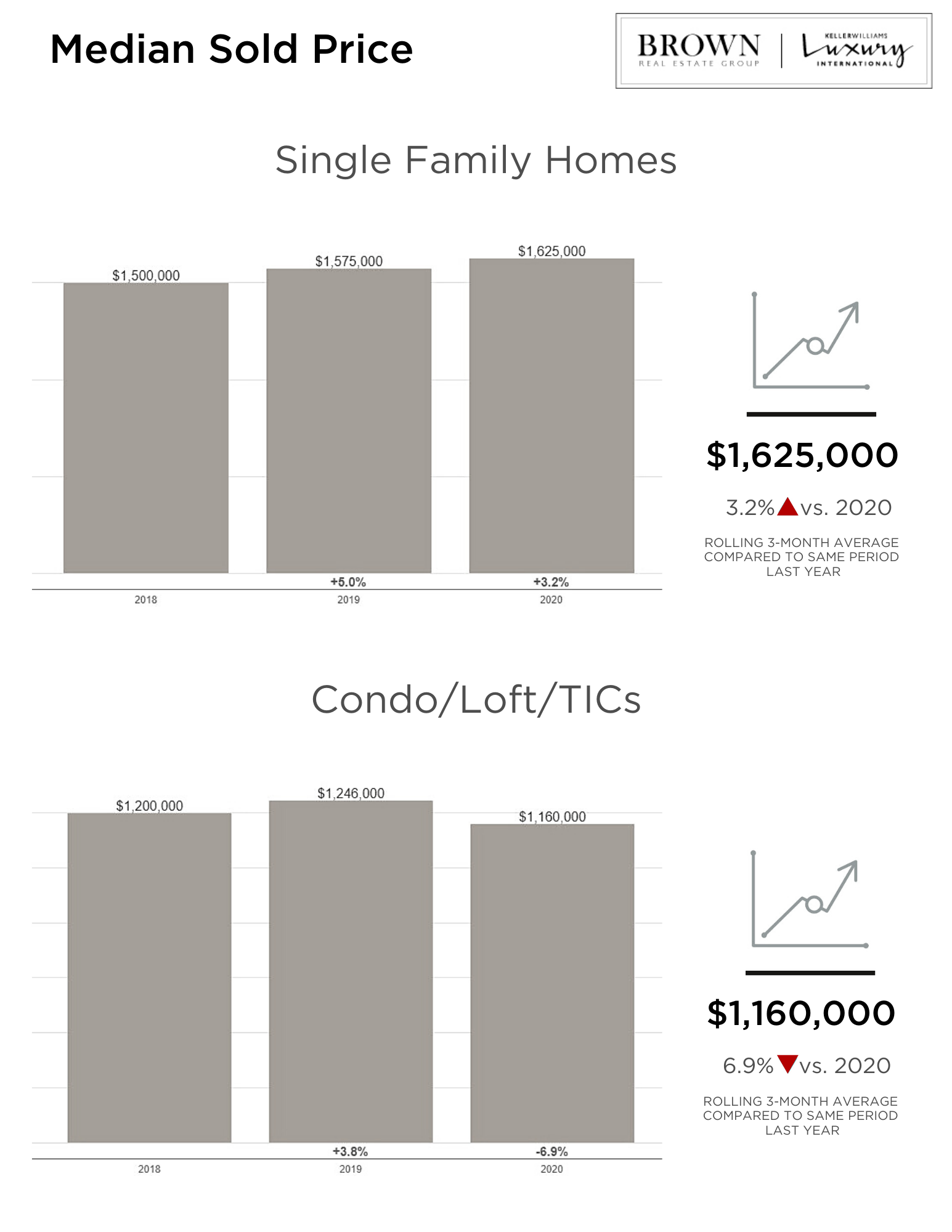 Inventory has risen for both property types year-over-year but has dropped from last month at 3 months for single-family homes and 6 months for condo/loft/TICs. 6 months of inventory is often regarded as a balanced market where buyers and sellers have equal leverage in the market and similar negotiating power. The absorption of inventory is largely due to strong buyer activity.