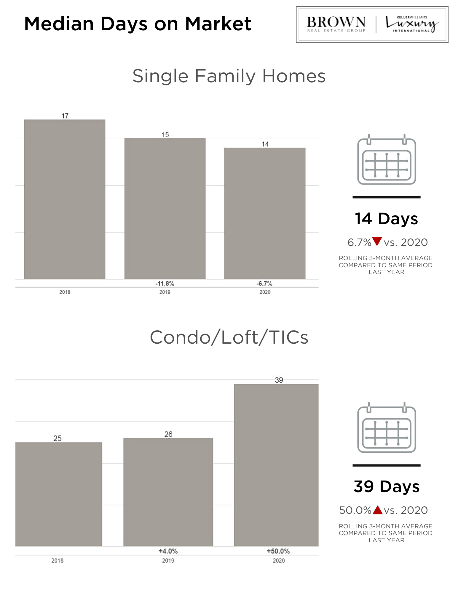 The length of time it takes to sell a single-family home remains extremely short at just 14 days. Condos/lofts/TICs are up slightly from last month to 39 days.